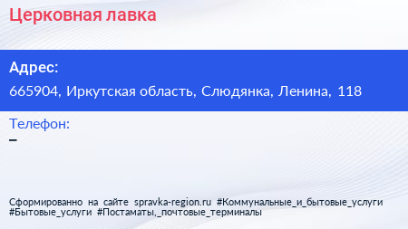 Церковная лавка по адресу 665904, Иркутская область, Слюдянка, Ленина, 118 в дальнейшем Организация, размещена в следующих категориях: