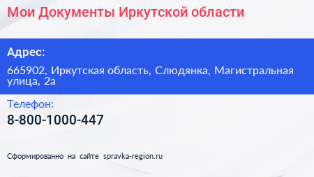 Мои Документы Иркутской области по адресу 665902, Иркутская область, Слюдянка, Магистральная улица, 2а в дальнейшем Организация, размещена в следующих категориях: