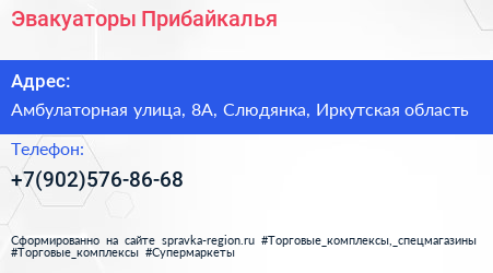 Эвакуаторы Прибайкалья по адресу Амбулаторная улица, 8А, Слюдянка, Иркутская область в дальнейшем Организация, размещена в следующих категориях:
