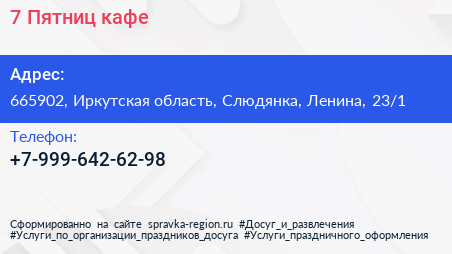 7 Пятниц, кафе по адресу 665902, Иркутская область, Слюдянка, Ленина, 23/1 в дальнейшем Организация, размещена в следующих категориях: