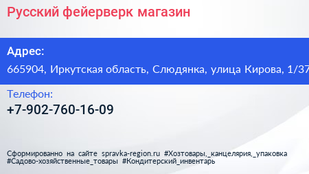 Русский фейерверк, магазин по адресу 665904, Иркутская область, Слюдянка, улица Кирова, 1/37 в дальнейшем Организация, размещена в следующих категориях: