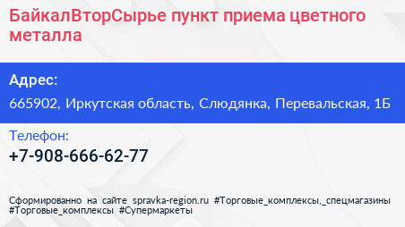 БайкалВторСырье, пункт приема цветного металла по адресу 665902, Иркутская область, Слюдянка, Перевальская, 1Б в дальнейшем Организация, размещена в следующих категориях: