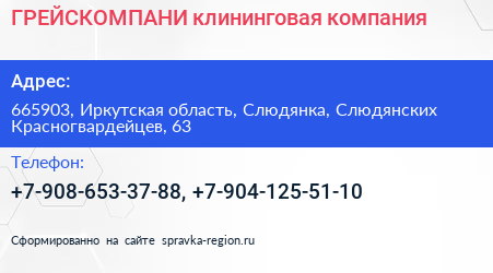 ГРЕЙСКОМПАНИ, клининговая компания по адресу 665903, Иркутская область, Слюдянка, Слюдянских Красногвардейцев, 63 в дальнейшем Организация, размещена в следующих категориях: