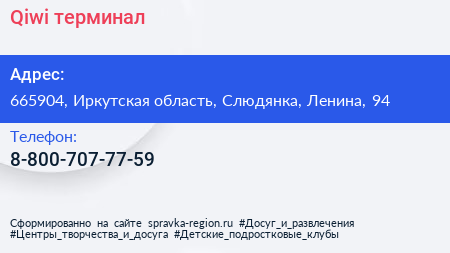 Qiwi, терминал по адресу 665904, Иркутская область, Слюдянка, Ленина, 94 в дальнейшем Организация, размещена в следующих категориях:
