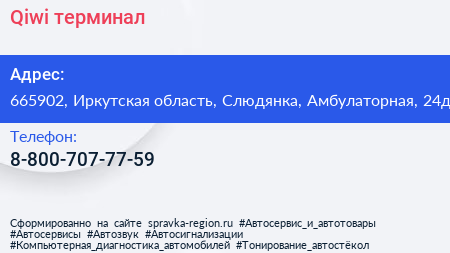 Qiwi, терминал по адресу 665902, Иркутская область, Слюдянка, Амбулаторная, 24д в дальнейшем Организация, размещена в следующих категориях:
