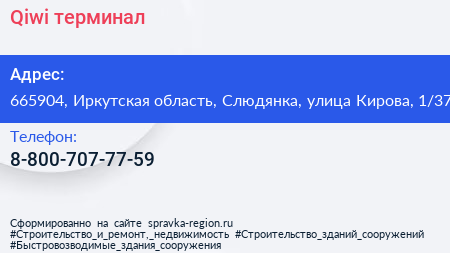 Qiwi, терминал по адресу 665904, Иркутская область, Слюдянка, улица Кирова, 1/37 в дальнейшем Организация, размещена в следующих категориях: