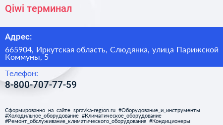 Qiwi, терминал по адресу 665904, Иркутская область, Слюдянка, улица Парижской Коммуны, 5 в дальнейшем Организация, размещена в следующих категориях: