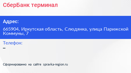 СберБанк, терминал по адресу 665904, Иркутская область, Слюдянка, улица Парижской Коммуны, 7 в дальнейшем Организация, размещена в следующих категориях: