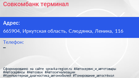 Совкомбанк, терминал по адресу 665904, Иркутская область, Слюдянка, Ленина, 116 в дальнейшем Организация, размещена в следующих категориях: