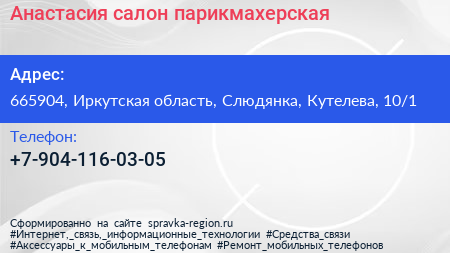 Анастасия, салон-парикмахерская по адресу 665904, Иркутская область, Слюдянка, Кутелева, 10/1 в дальнейшем Организация, размещена в следующих категориях: