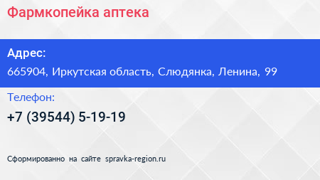 Фармкопейка, аптека по адресу 665904, Иркутская область, Слюдянка, Ленина, 99 в дальнейшем Организация, размещена в следующих категориях: