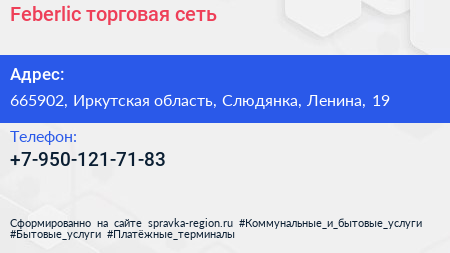 Feberlic, торговая сеть по адресу 665902, Иркутская область, Слюдянка, Ленина, 19 в дальнейшем Организация, размещена в следующих категориях: