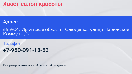 Хвост, салон красоты по адресу 665904, Иркутская область, Слюдянка, улица Парижской Коммуны, 3 в дальнейшем Организация, размещена в следующих категориях: