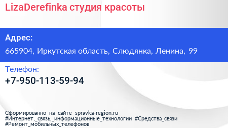 LizaDerefinka, студия красоты по адресу 665904, Иркутская область, Слюдянка, Ленина, 99 в дальнейшем Организация, размещена в следующих категориях:
