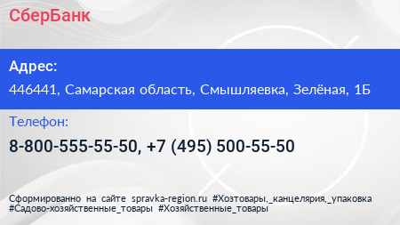СберБанк по адресу 446441, Самарская область, Смышляевка, Зелёная, 1Б в дальнейшем Организация, размещена в следующих категориях: