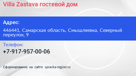 Villa Zastava, гостевой дом по адресу 446441, Самарская область, Смышляевка, Северный переулок, 9 в дальнейшем Организация, размещена в следующих категориях: