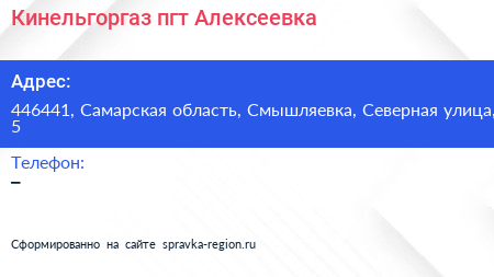 Кинельгоргаз, пгт. Алексеевка по адресу 446441, Самарская область, Смышляевка, Северная улица, 5 в дальнейшем Организация, размещена в следующих категориях: