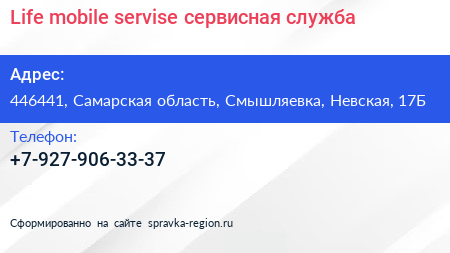 Life-mobile servise, сервисная служба по адресу 446441, Самарская область, Смышляевка, Невская, 17Б в дальнейшем Организация, размещена в следующих категориях:
