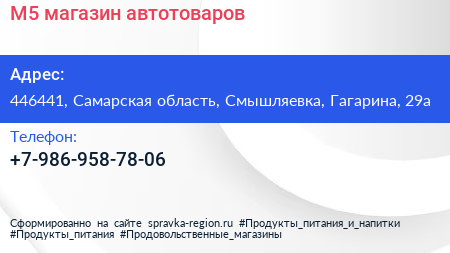 М5, магазин автотоваров по адресу 446441, Самарская область, Смышляевка, Гагарина, 29а в дальнейшем Организация, размещена в следующих категориях: