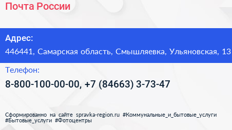 Почта России по адресу 446441, Самарская область, Смышляевка, Ульяновская, 13 в дальнейшем Организация, размещена в следующих категориях: