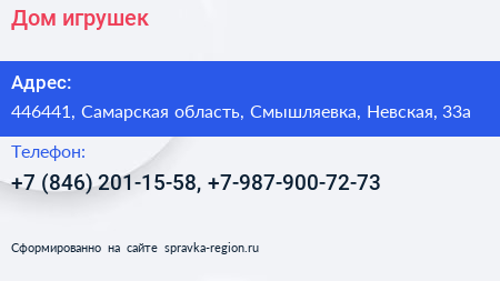Дом игрушек по адресу 446441, Самарская область, Смышляевка, Невская, 33а в дальнейшем Организация, размещена в следующих категориях: