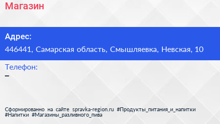 Магазин по адресу 446441, Самарская область, Смышляевка, Невская, 10 в дальнейшем Организация, размещена в следующих категориях:
