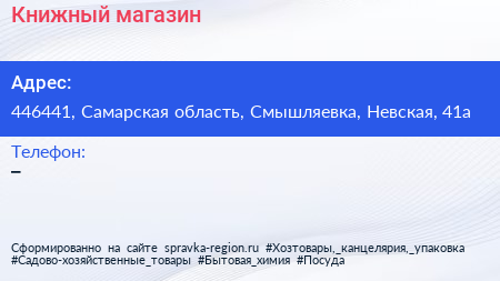 Книжный магазин по адресу 446441, Самарская область, Смышляевка, Невская, 41а в дальнейшем Организация, размещена в следующих категориях: