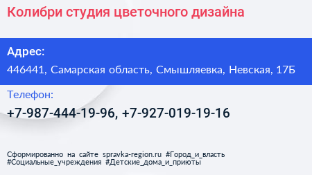 Колибри, студия цветочного дизайна по адресу 446441, Самарская область, Смышляевка, Невская, 17Б в дальнейшем Организация, размещена в следующих категориях: