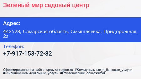 Зеленый мир, садовый центр по адресу 443528, Самарская область, Смышляевка, Придорожная, 2а в дальнейшем Организация, размещена в следующих категориях: