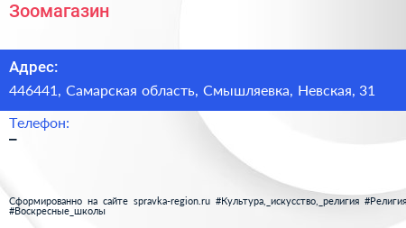 Зоомагазин по адресу 446441, Самарская область, Смышляевка, Невская, 31 в дальнейшем Организация, размещена в следующих категориях: