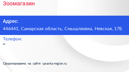 Зоомагазин по адресу 446441, Самарская область, Смышляевка, Невская, 17Б в дальнейшем Организация, размещена в следующих категориях: