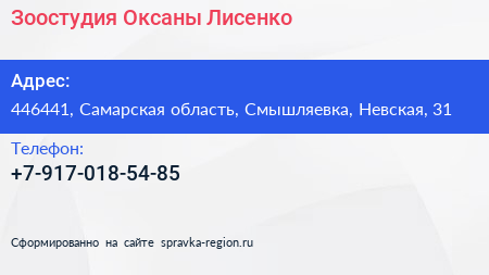 Зоостудия Оксаны Лисенко по адресу 446441, Самарская область, Смышляевка, Невская, 31 в дальнейшем Организация, размещена в следующих категориях: