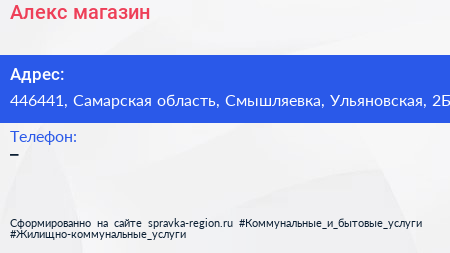 Алекс, магазин по адресу 446441, Самарская область, Смышляевка, Ульяновская, 2Б в дальнейшем Организация, размещена в следующих категориях: