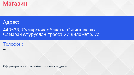 Магазин по адресу 443528, Самарская область, Смышляевка, Самара-Бугуруслан трасса 27 километр, 7а в дальнейшем Организация, размещена в следующих категориях: