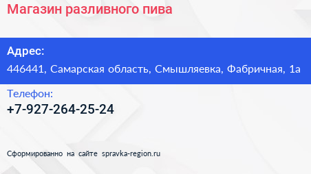 Магазин разливного пива по адресу 446441, Самарская область, Смышляевка, Фабричная, 1а в дальнейшем Организация, размещена в следующих категориях:
