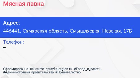 Мясная лавка по адресу 446441, Самарская область, Смышляевка, Невская, 17Б в дальнейшем Организация, размещена в следующих категориях: