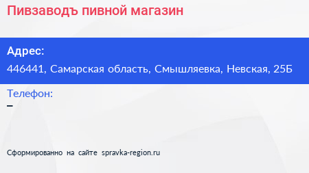 Пивзаводъ, пивной магазин по адресу 446441, Самарская область, Смышляевка, Невская, 25Б в дальнейшем Организация, размещена в следующих категориях: