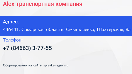 Alex, транспортная компания по адресу 446441, Самарская область, Смышляевка, Шахтёрская, 8а в дальнейшем Организация, размещена в следующих категориях:
