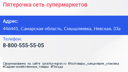 Пятерочка, сеть супермаркетов по адресу 446441, Самарская область, Смышляевка, Невская, 33а в дальнейшем Организация, размещена в следующих категориях:
