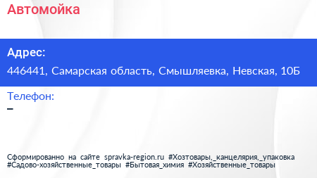 Автомойка по адресу 446441, Самарская область, Смышляевка, Невская, 10Б в дальнейшем Организация, размещена в следующих категориях: