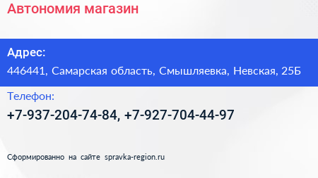 Автономия, магазин по адресу 446441, Самарская область, Смышляевка, Невская, 25Б в дальнейшем Организация, размещена в следующих категориях: