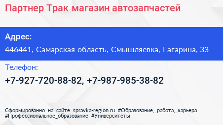 Партнер Трак, магазин автозапчастей по адресу 446441, Самарская область, Смышляевка, Гагарина, 33 в дальнейшем Организация, размещена в следующих категориях:
