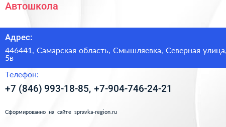Автошкола по адресу 446441, Самарская область, Смышляевка, Северная улица, 5в в дальнейшем Организация, размещена в следующих категориях: