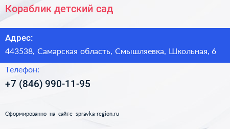 Кораблик, детский сад по адресу 443538, Самарская область, Смышляевка, Школьная, 6 в дальнейшем Организация, размещена в следующих категориях: