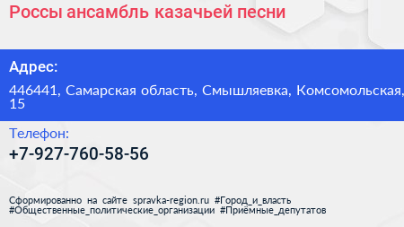 Россы, ансамбль казачьей песни по адресу 446441, Самарская область, Смышляевка, Комсомольская, 15 в дальнейшем Организация, размещена в следующих категориях: