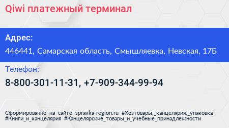 Qiwi, платежный терминал по адресу 446441, Самарская область, Смышляевка, Невская, 17Б в дальнейшем Организация, размещена в следующих категориях: