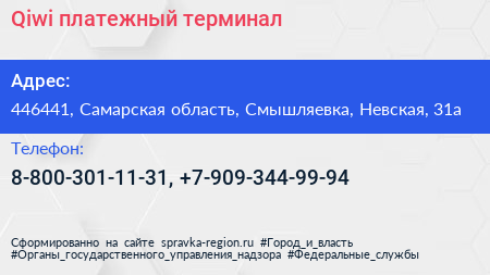 Qiwi, платежный терминал по адресу 446441, Самарская область, Смышляевка, Невская, 31а в дальнейшем Организация, размещена в следующих категориях: