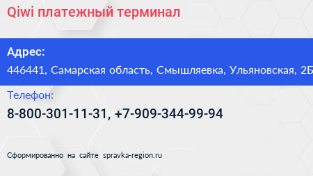 Qiwi, платежный терминал по адресу 446441, Самарская область, Смышляевка, Ульяновская, 2Б в дальнейшем Организация, размещена в следующих категориях:
