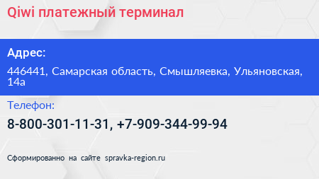 Qiwi, платежный терминал по адресу 446441, Самарская область, Смышляевка, Ульяновская, 14а в дальнейшем Организация, размещена в следующих категориях:
