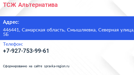 ТСЖ Альтернатива по адресу 446441, Самарская область, Смышляевка, Северная улица, 5Б в дальнейшем Организация, размещена в следующих категориях: